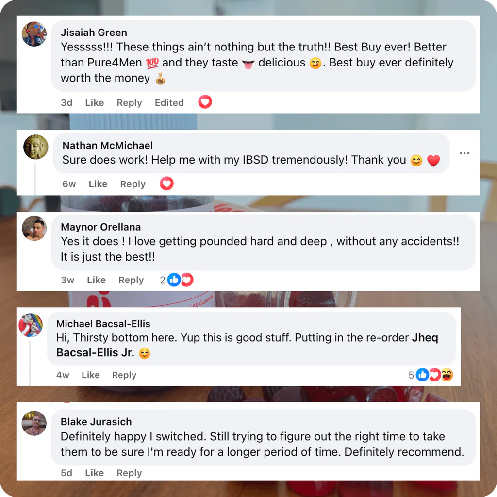 "I have tried many supplements, but Peachy Men actually works, and works very well. I'm ready whenever my husband needs me, and we don't worry about surprises. He can use me for as long or for whatever he needs - and I love it! These gummies truly work! I have already referred friends to try them also. "